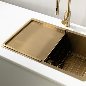 Beyond tapware and sinks, Buildmat’s Alma collection includes colour-matched drainboard sinks and premium kitchen accessories like roll mats, dish racks and glass rinsers — all in the same brushed brass gold tone. That means no mismatched metals, no compromises — just a home that looks considered, right down to the details.