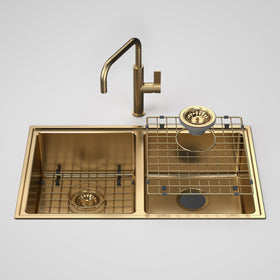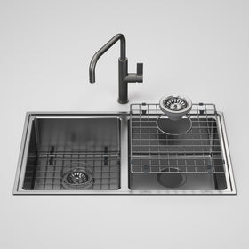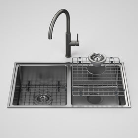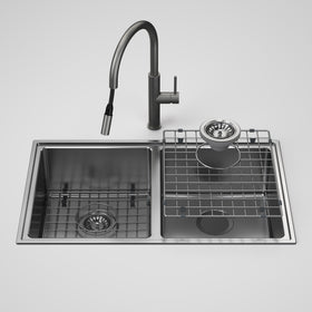 Caroma sinks are designed to work seamlessly with kitchen mixer taps, including pull-out and gooseneck styles. Keep your sink area organised with kitchen accessories like dishracks and drainboards, sink protector grids, and over-the-sink chopping boards.