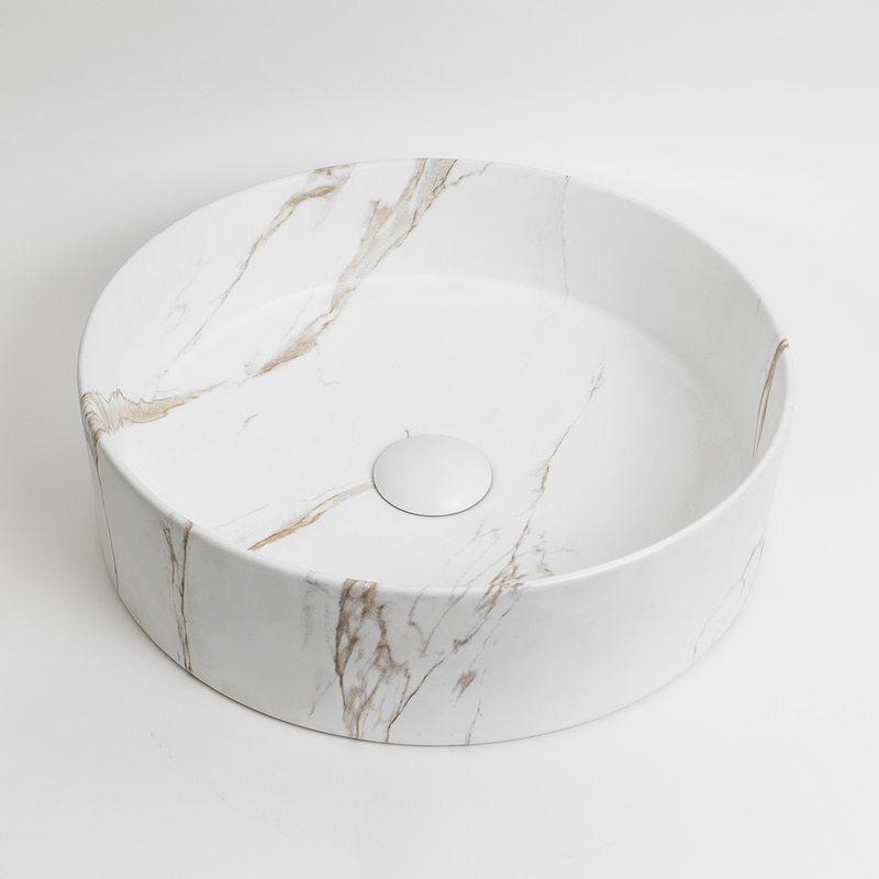 These are typically made from composite materials or are ceramic basins with a printed or cast marble effect. While they’re durable, the patterning may vary across batches. Always view your specific piece before installation.