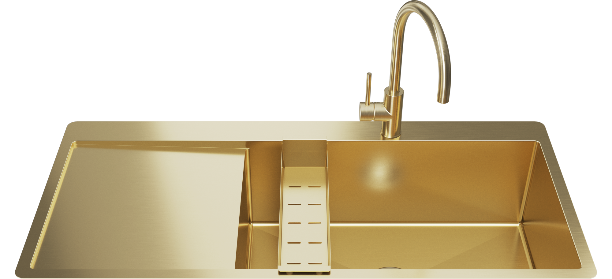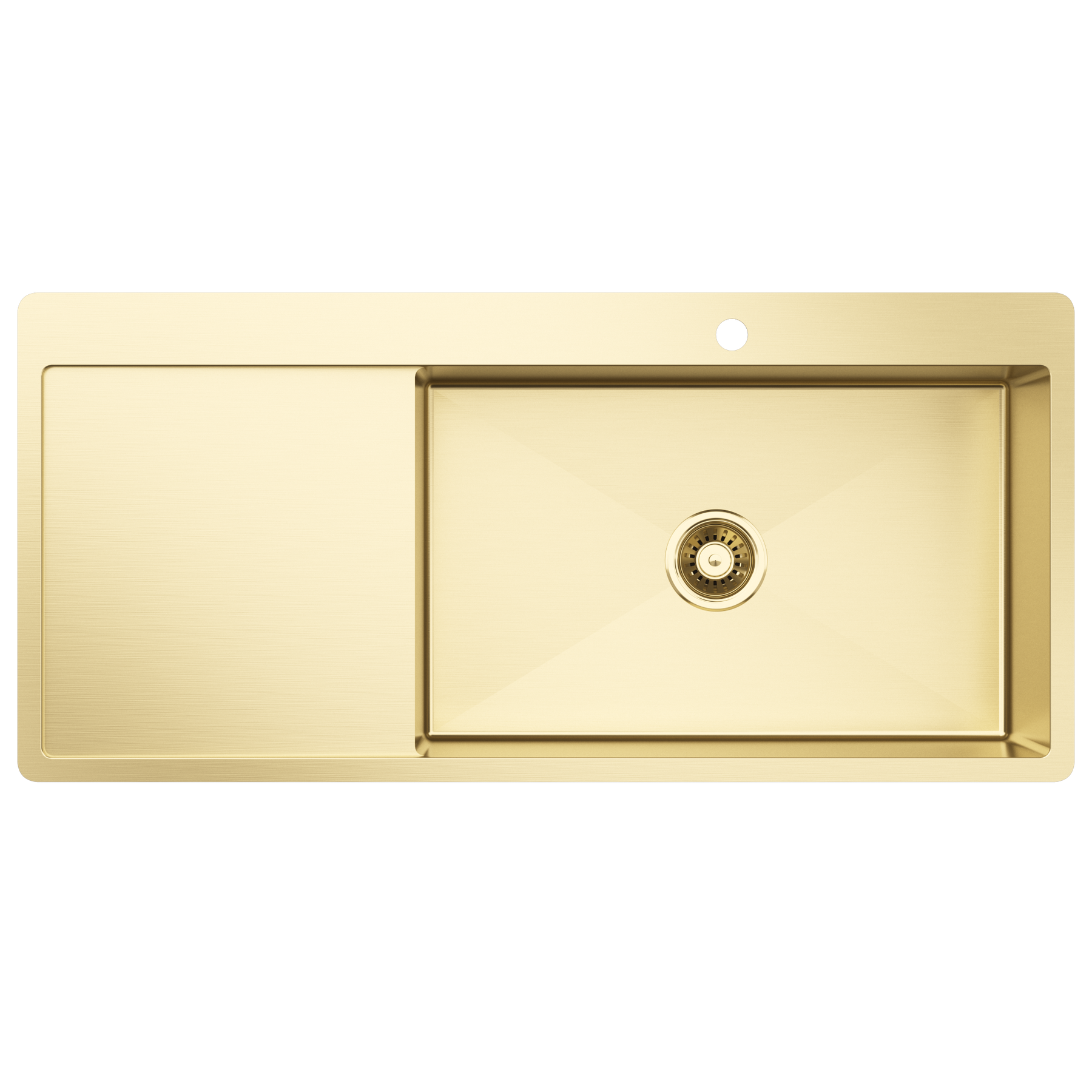 Brushed Brass Gold Iver 1080x500 Single Bowl Tap Landing with Left Drain Board Sink