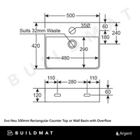 Argent Evo Neu 500mm Rectangular Counter Top or Wall Hung Basin with Overflow Gloss White