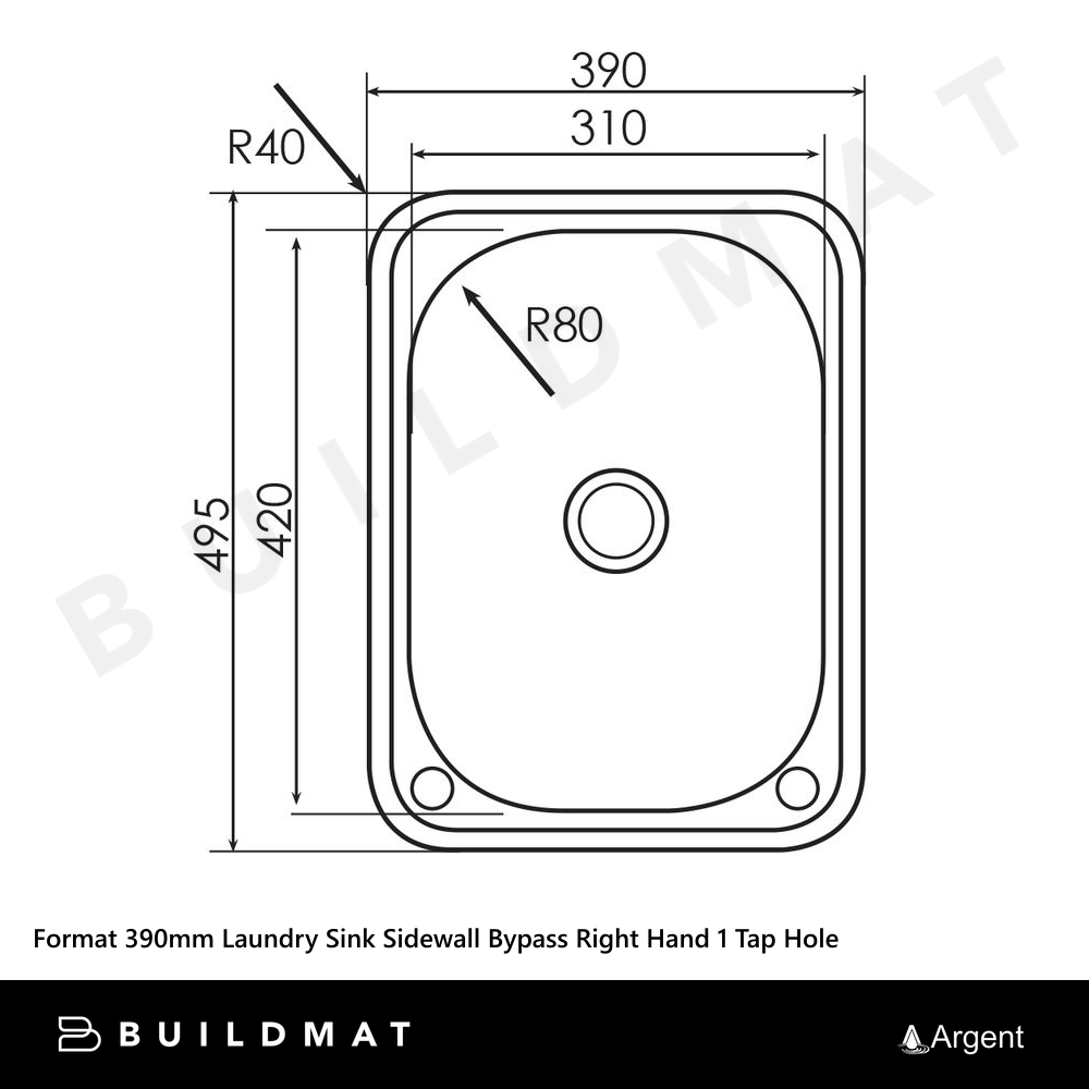 Argent Format 390mm Laundry Sink Sidewall Bypass Right Hand 1 Tap Hole Stainless Steel