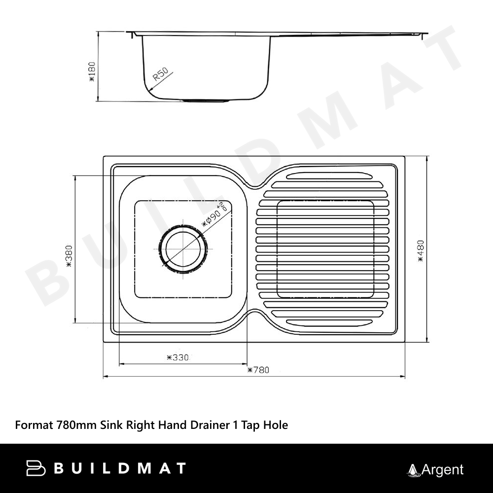 Argent Format 780mm Sink with Right Hand Drainboard 1 Tap Hole Stainless Steel