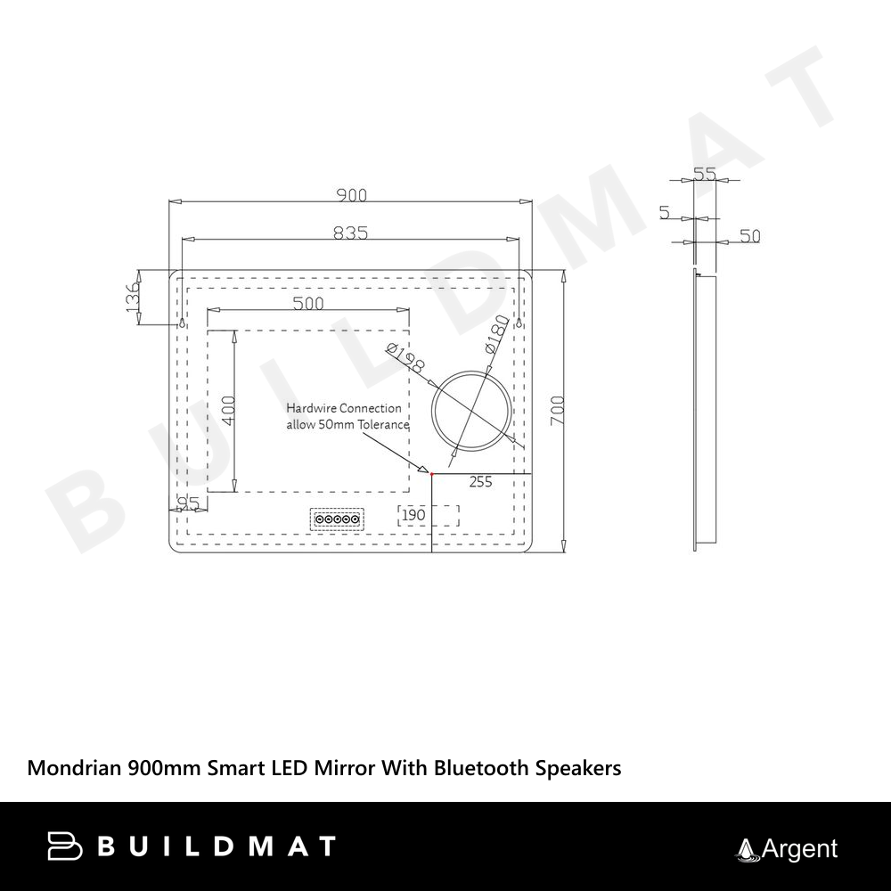 Product Details SKU: AR50905 Brand: Argent Range: Mondrian Warranty: 1 Year (conditions apply) Width: 900mm Height: 700mm Additional Features: Demister TriColour LED Lighting Dimmer 3x Magnifying Mirror Bluetooth Speakers IP44... Read more