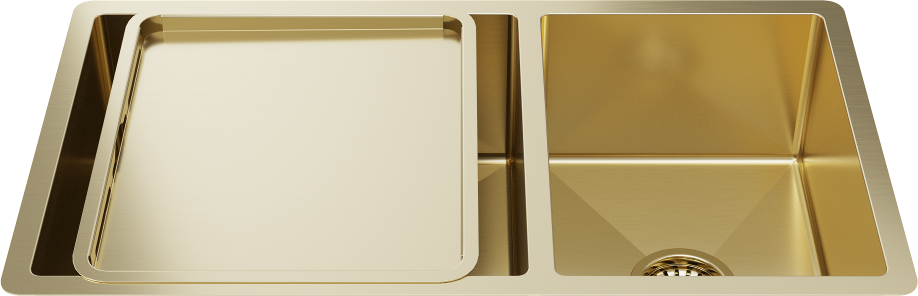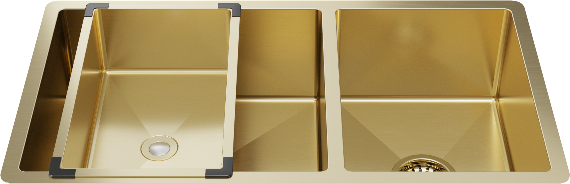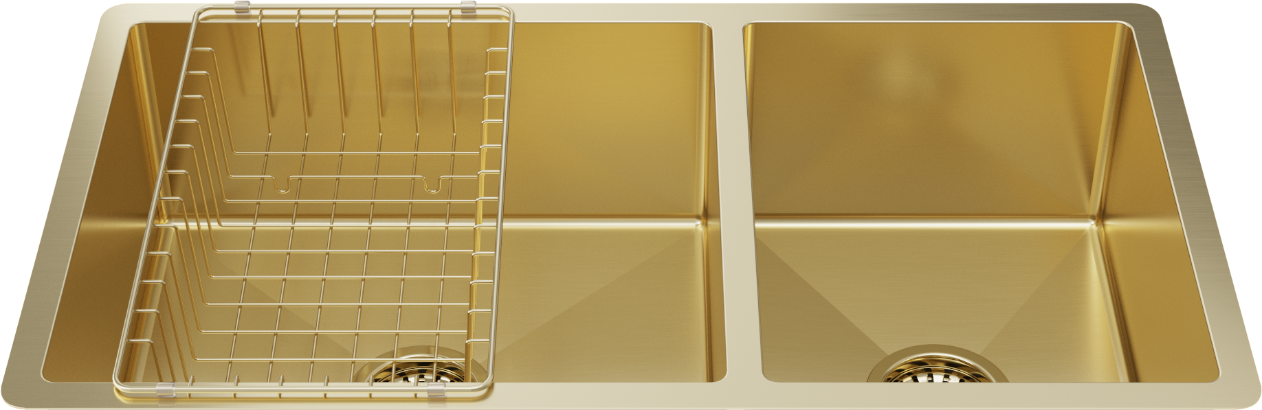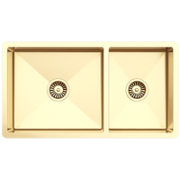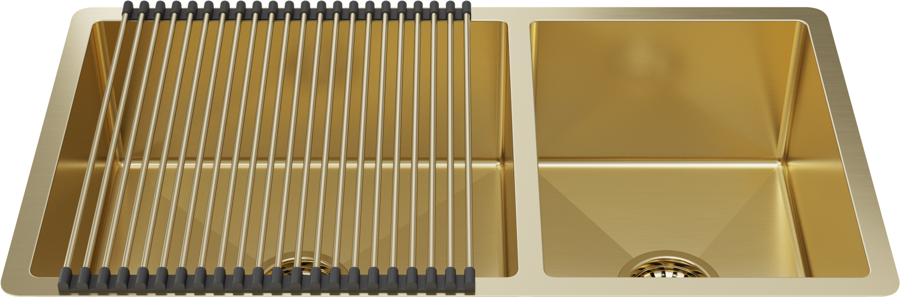 Matching Brass Gold Bottom Grid and Brass Gold Strainer Included 1.5mm thick (16 gauge) Stainless Steel for increased durability Massive 450x400mm and 300x400mm double bowl Convenient extra bowl for small items and sink accessories... Read more