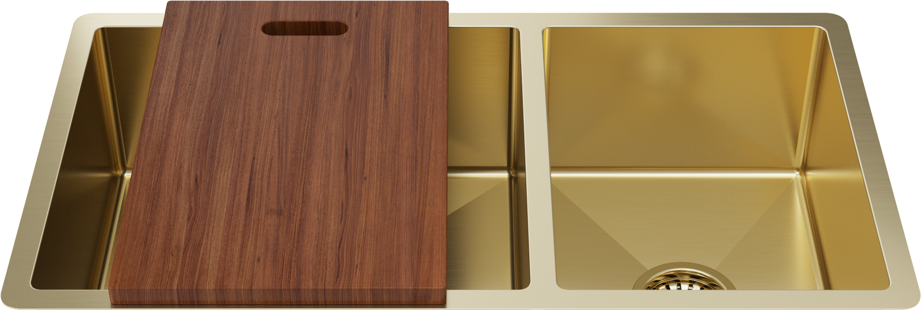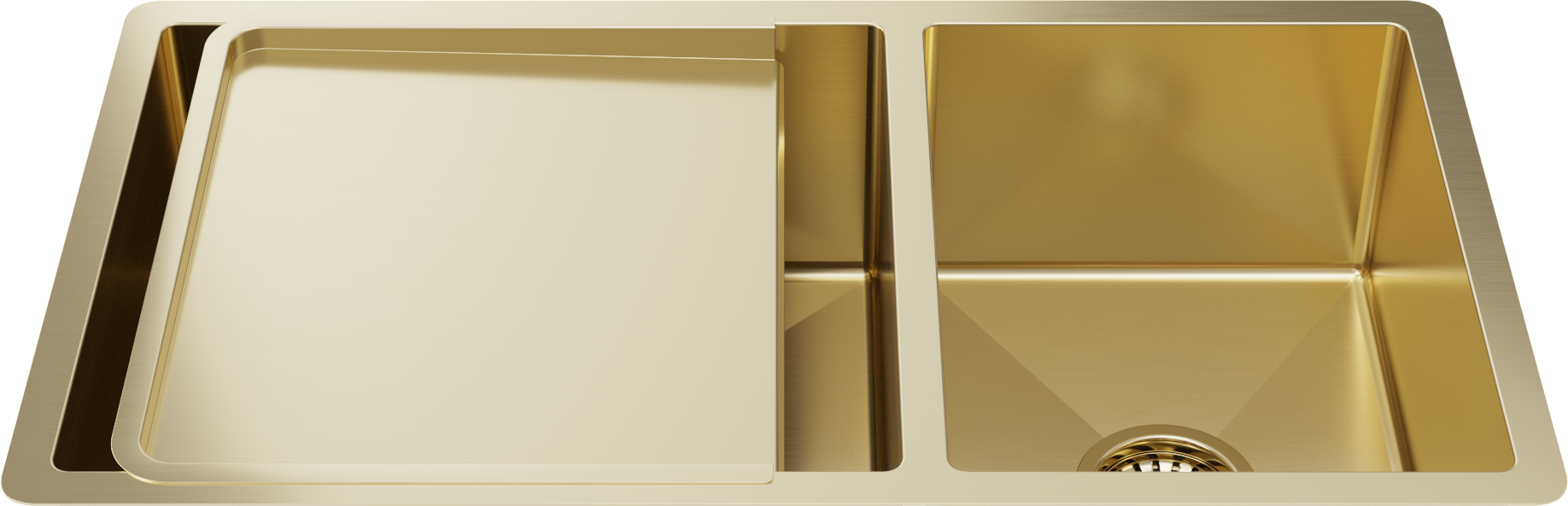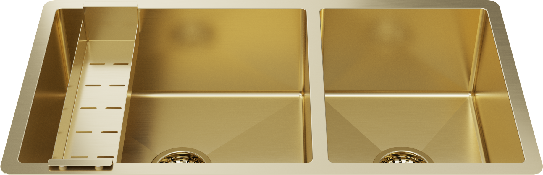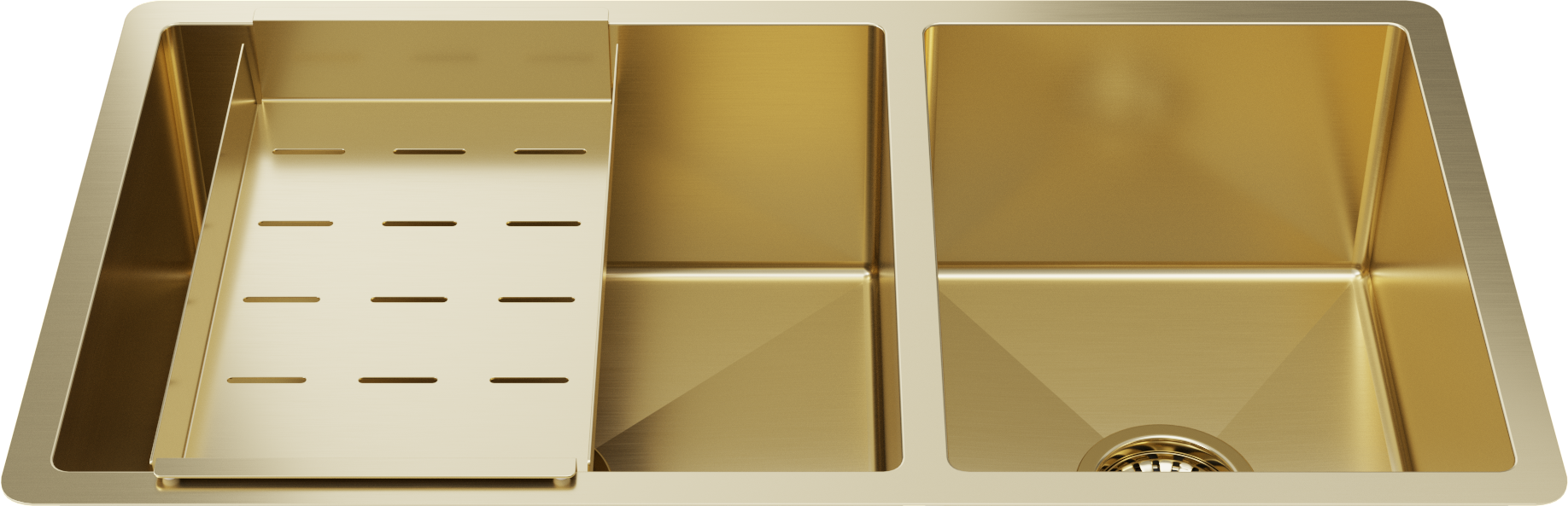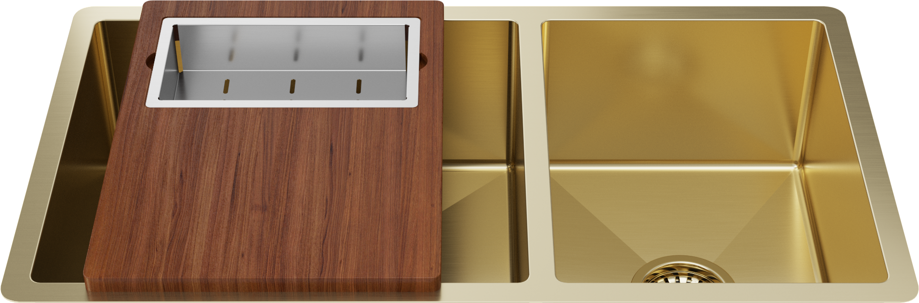 Matching Brass Gold Bottom Grid and Brass Gold Strainer Included 1.5mm thick (16 gauge) Stainless Steel for increased durability Massive 450x400mm and 300x400mm double bowl Convenient extra bowl for small items and sink accessories... Read more