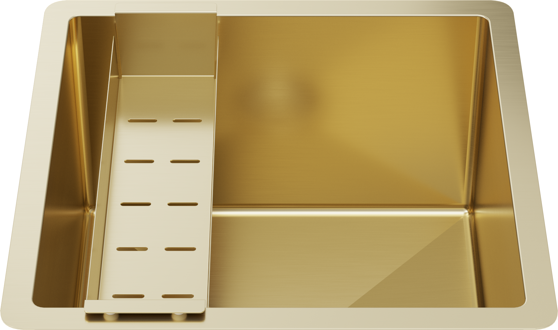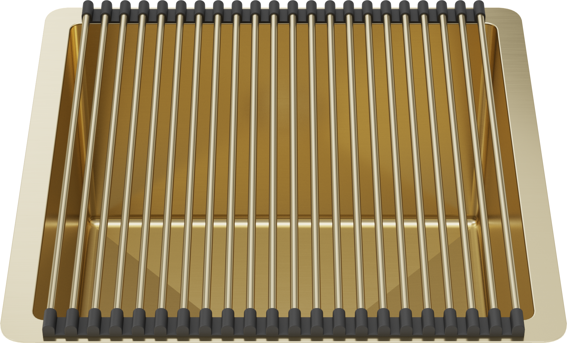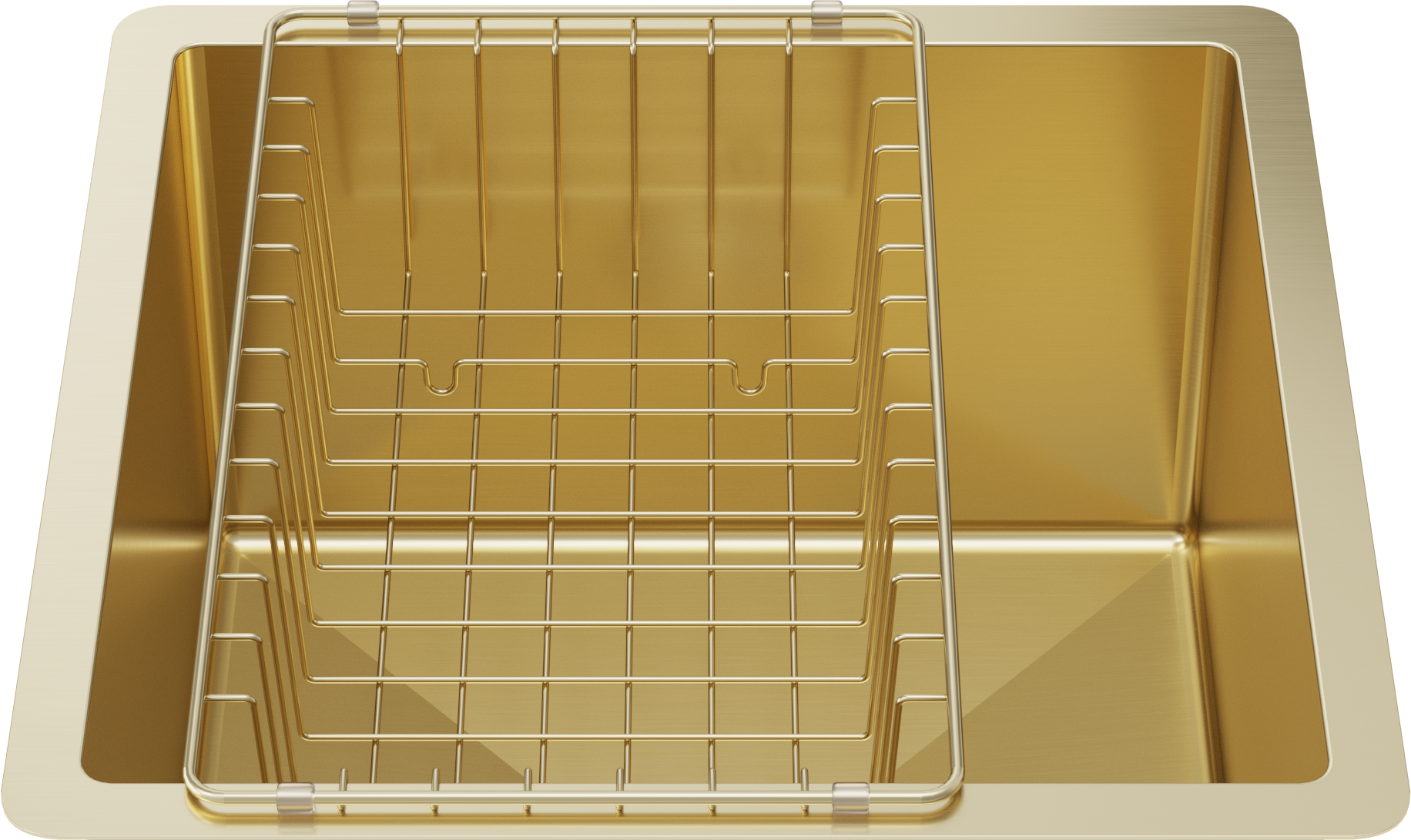 Matching Brass Gold Bottom Grid and Brass Gold Strainer Included Whether you're limited on bench space or just need a square and compact sink, the Nala 450 is the perfect... Read more
