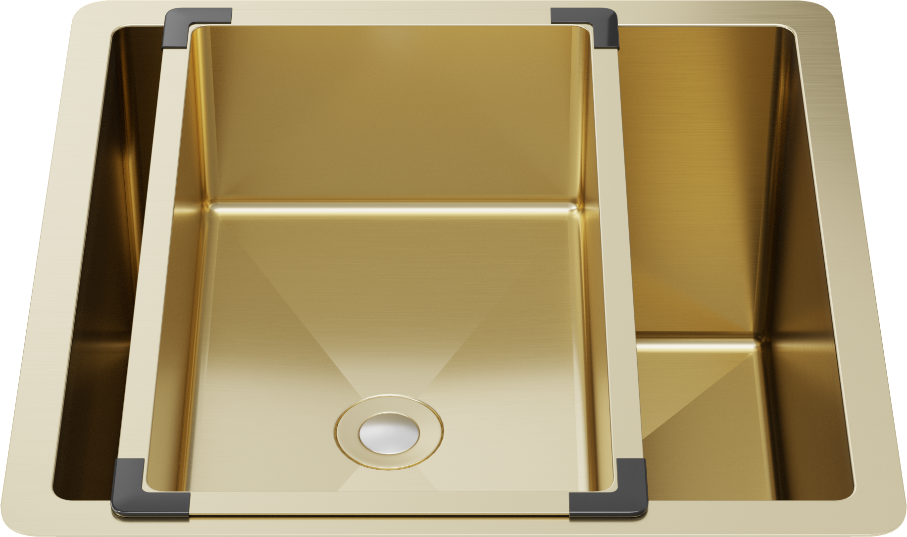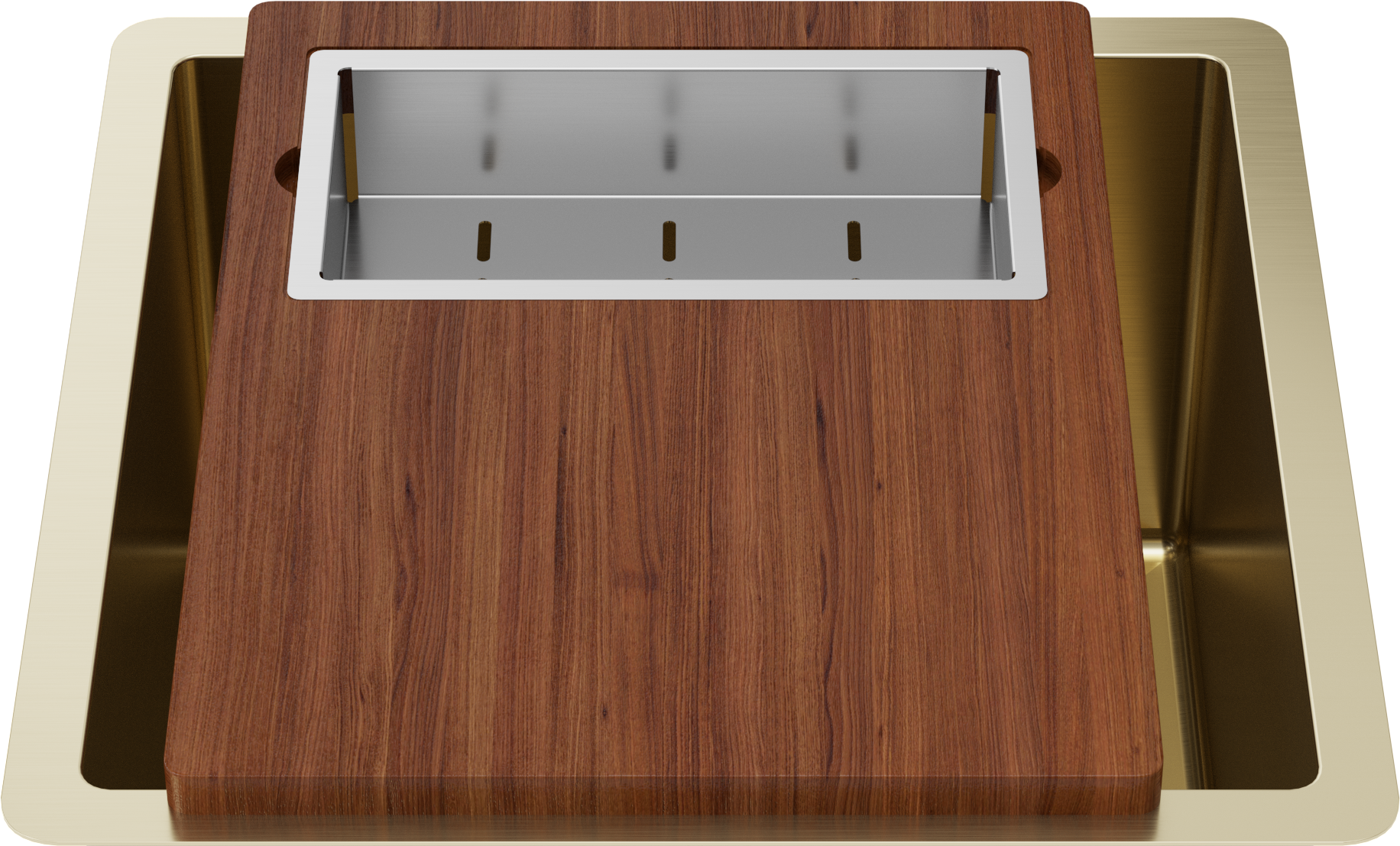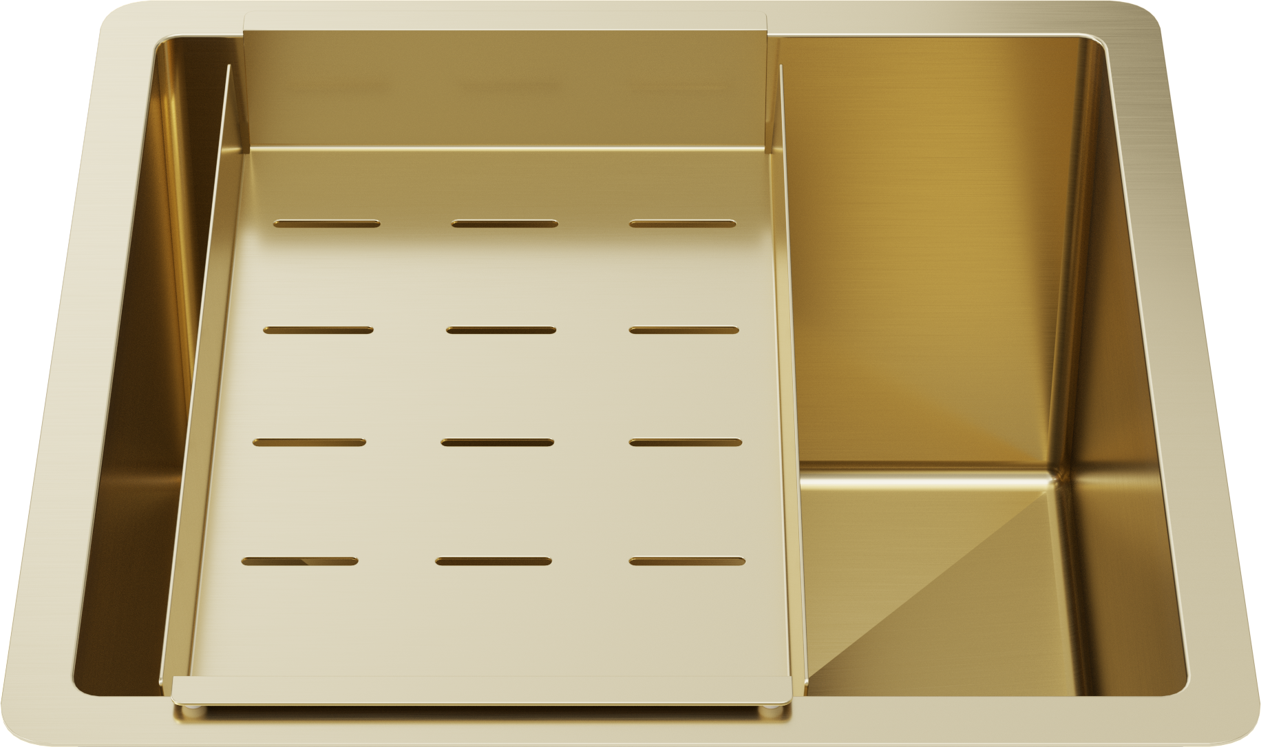 Matching Brass Gold Bottom Grid and Brass Gold Strainer Included Whether you're limited on bench space or just need a square and compact sink, the Nala 450 is the perfect... Read more