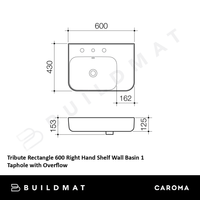 Caroma Tribute Rectangle 600 Right Hand Shelf Wall Basin 1 Taphole with Overflow White