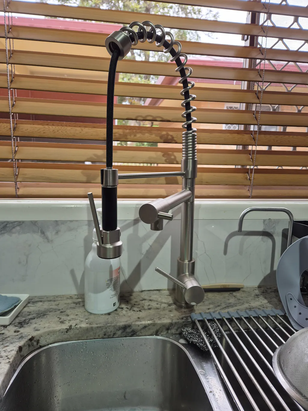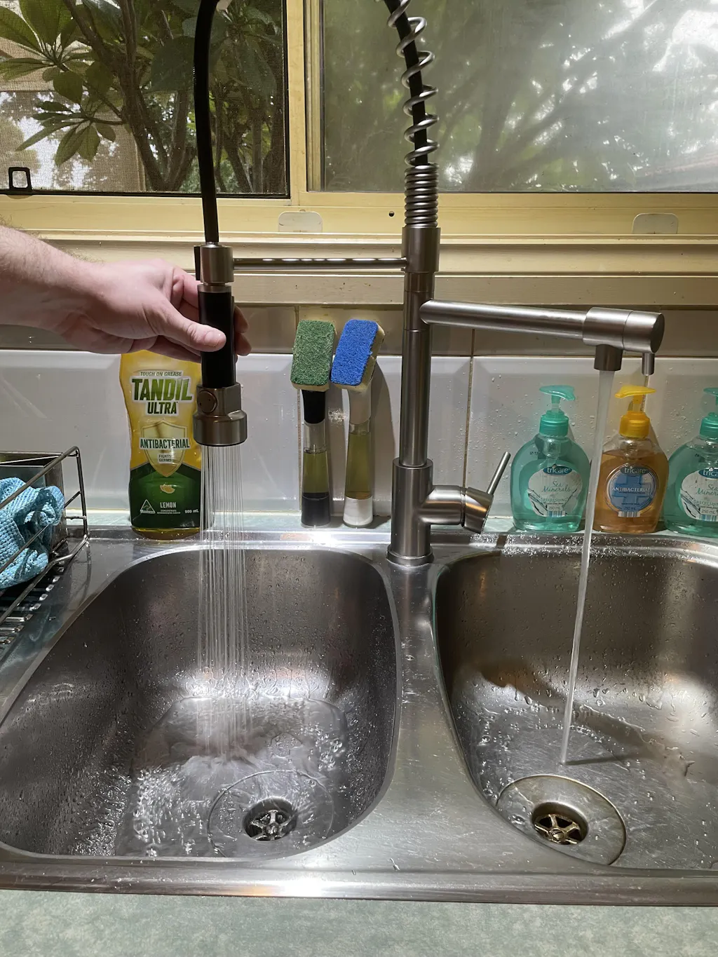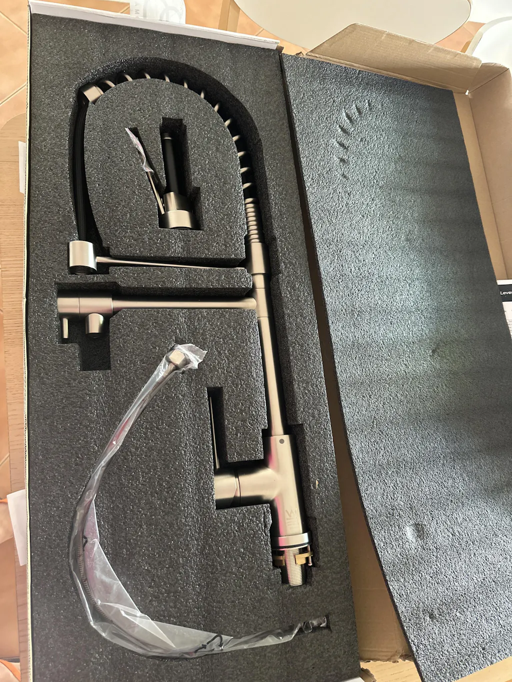 WELS Rating: 6L/Min, 5Star Ceramic cartridge disk Brushed Nickel Finish Black Handle with Spray Trigger Height 585mm Dual Spout function Pull out Spray Nozzle - 204mm width Swivel spout - 200mm width... Read more