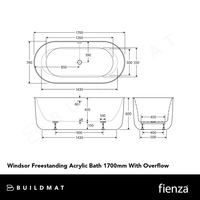 Fienza Windsor Freestanding Acrylic Bath 1700mm with Overflow Gloss White