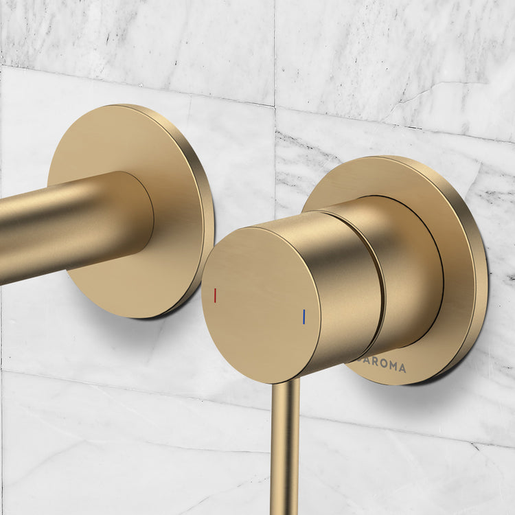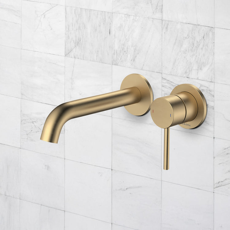Caroma Liano II 175mm Wall Basin/Bath Mixer and Outlet Lead Free Brushed Brass