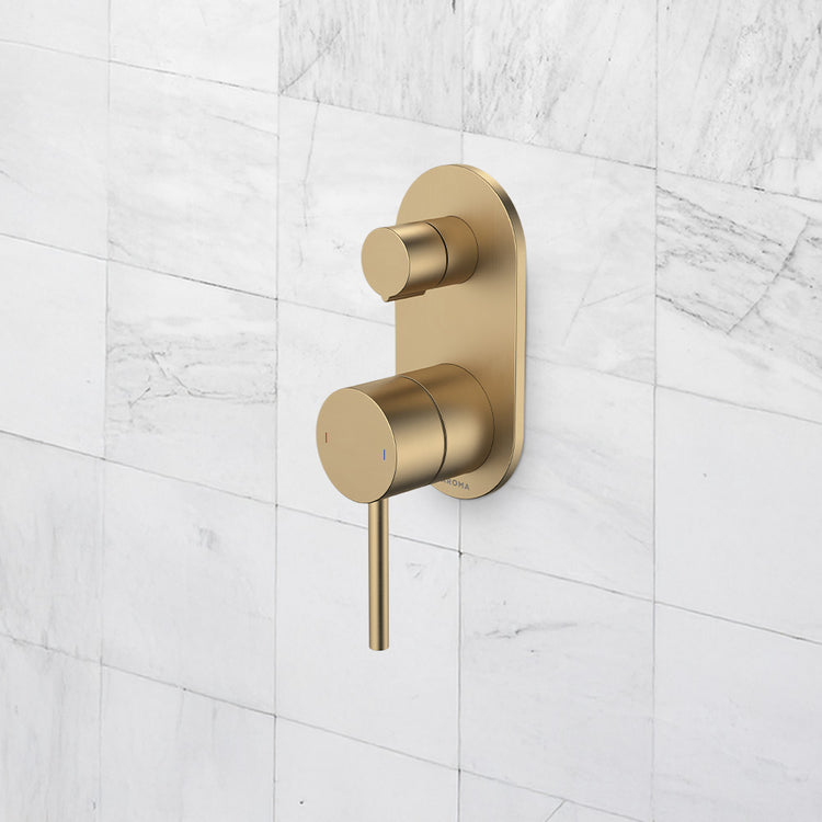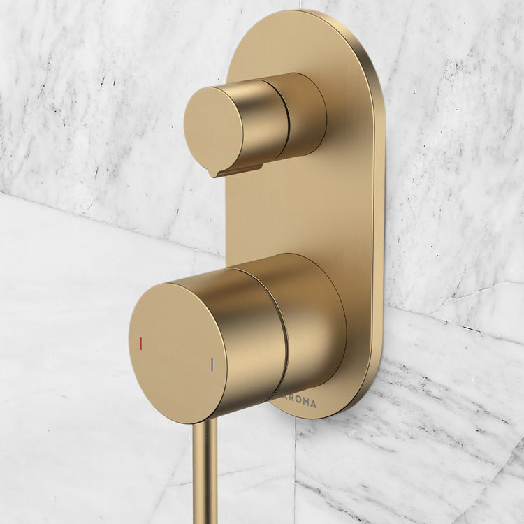 Caroma Liano II Bath Shower Mixer With Diverter and Outlet Rounded Plate Brushed Brass