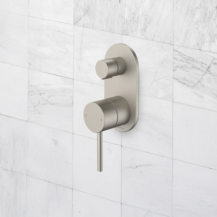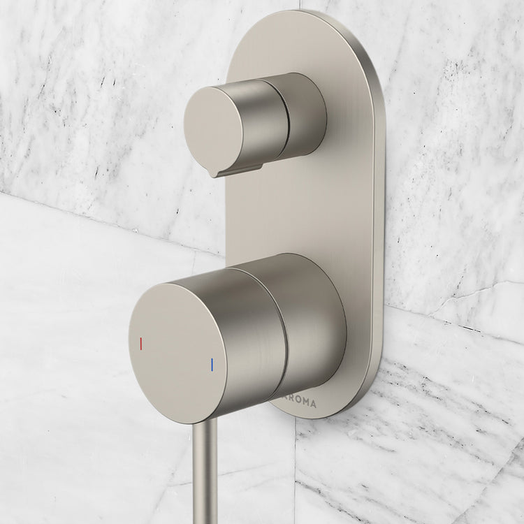 Caroma Liano II Bath Shower Mixer With Diverter and Outlet Rounded Plate Brushed Nickel