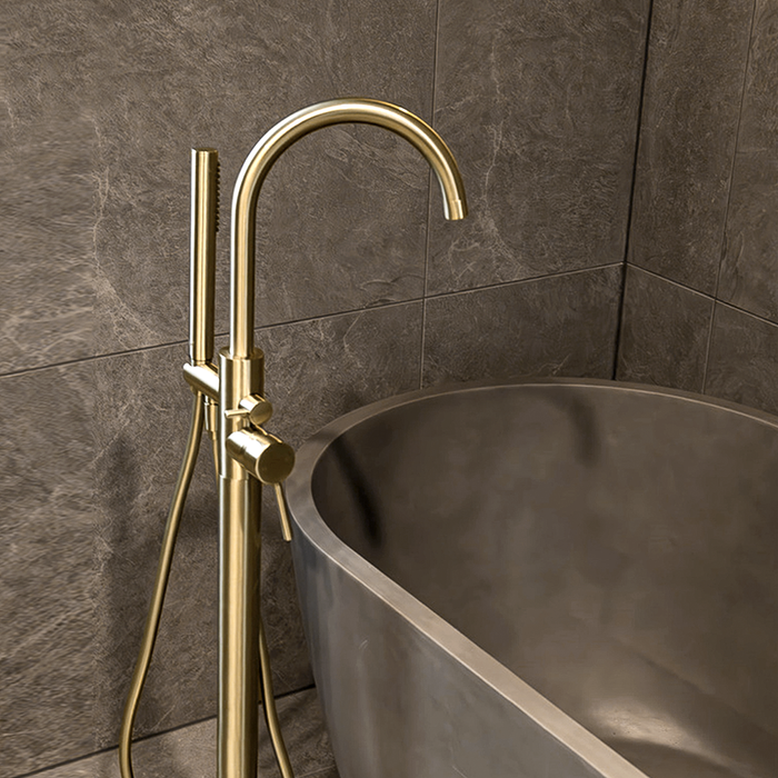 Nero Mecca Round Freestanding Mixer with Hand Shower Brushed Gold
