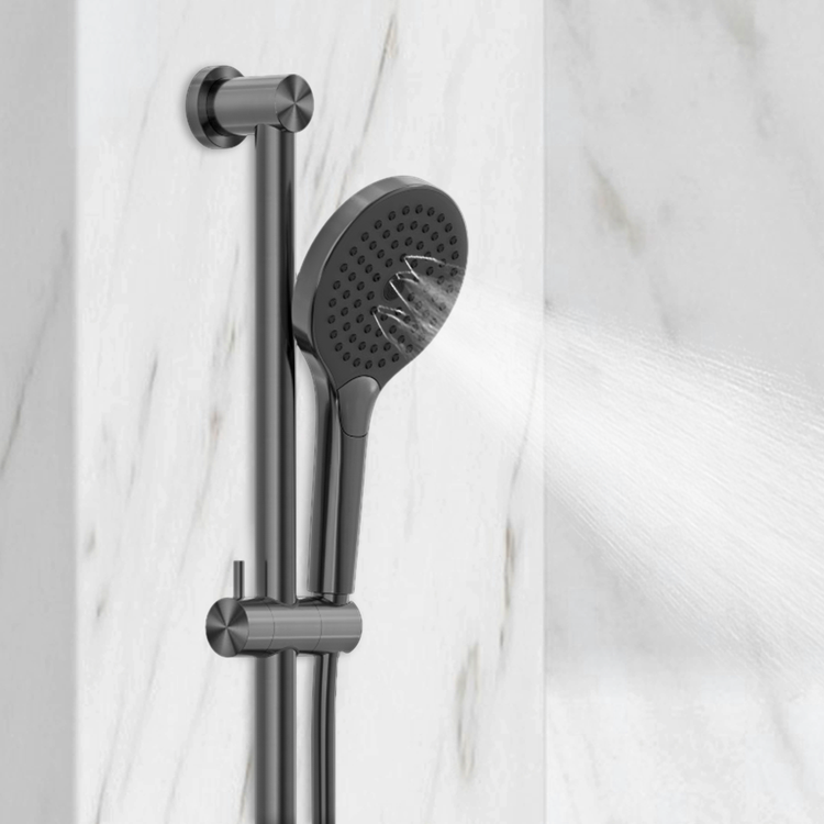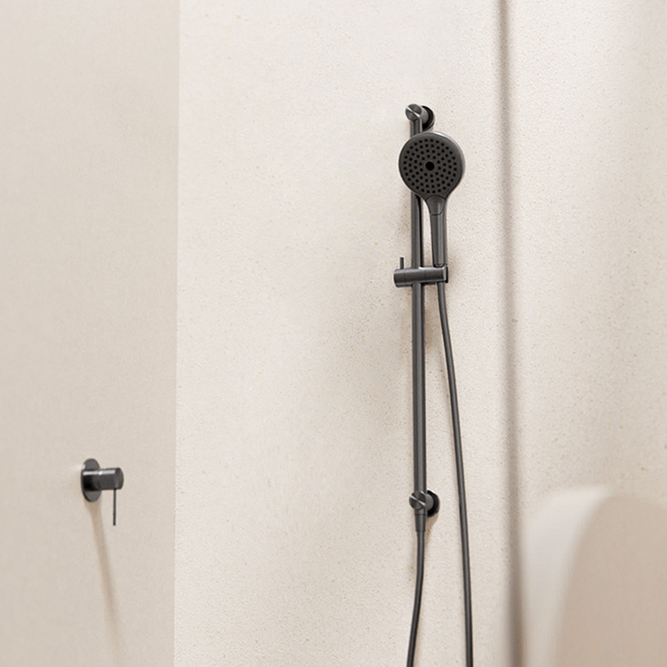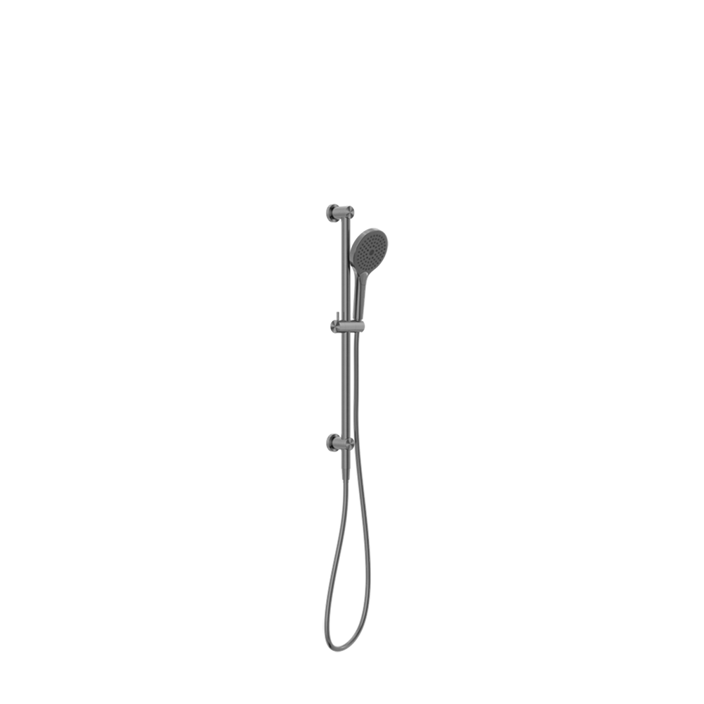 Product Type: Rail ShowerProduct SKU: NR221905GGMColour: GunmetalMaterial: BrassWELS Rating: 9L/Min,3StarWELS Registration No: S17300 Features High quality solid metal rail One touch nozzle cleaning 3 function handset Exposure round rail with built-in... Read more