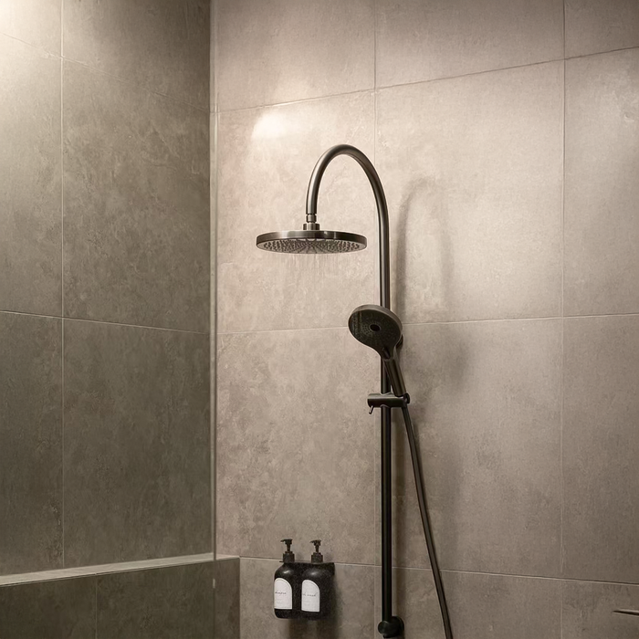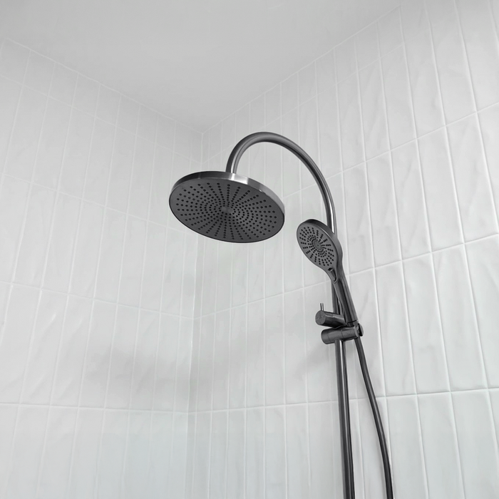 Product Type: Twin ShowersProduct SKU: NR221905eGMColour: Gunmetal GreyMaterial: BrassWELS Rating: 11L/Min, 2StarWELS Registration No: S15226 Features 3 Function Handshower and 250mm Exposure dome overhead drenched Adjustable bottom pillar for easy retro-fit... Read more