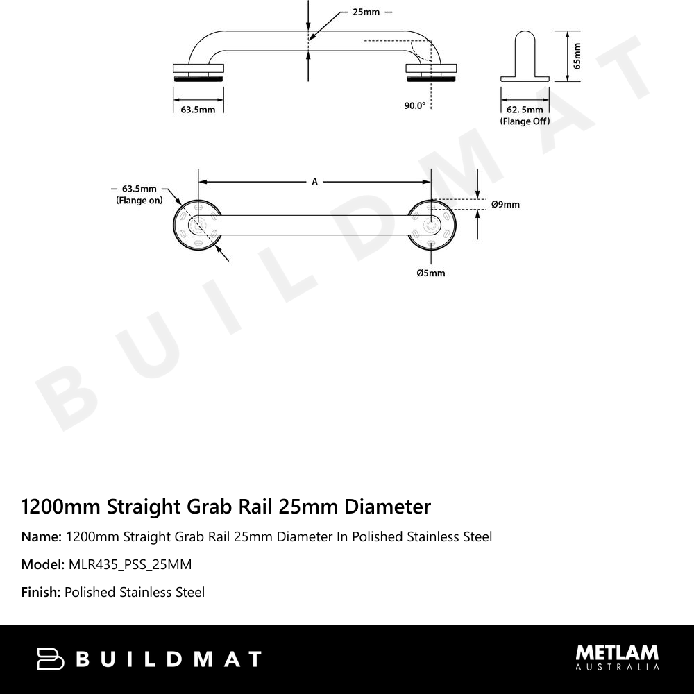 Metlam 1200mm Straight Grab Rail 25mm Diameter In Polished Stainless Steel