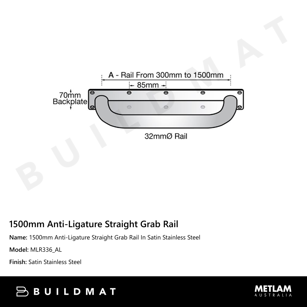 Metlam 1500mm Anti-Ligature Straight Grab Rail In Satin Stainless Steel