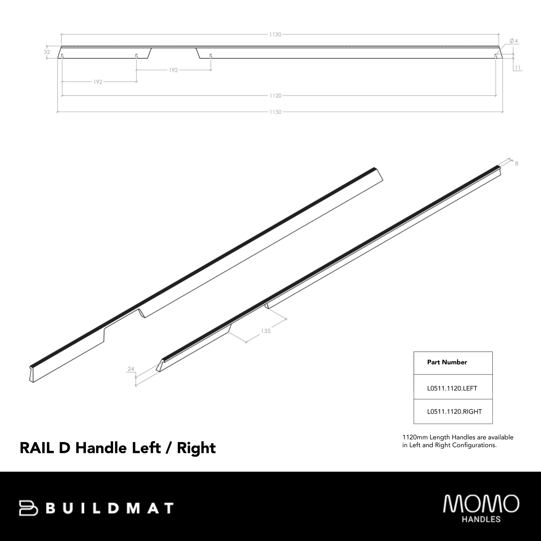 Momo Handles Momo Rail D Handle Right Hand 1120mm Brushed Dark Brass