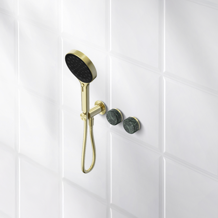 Product TypeShower System ColourBrushed Gold MaterialBrass And Natural Marble WELS Rating4 Stars WELS Registration NoS18742 Note: Custom handle, delivered within 6 weeks. Read more