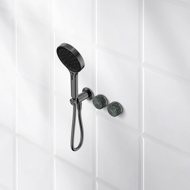 Product TypeShower System ColourGunmetal MaterialBrass And Natural Marble WELS Rating4 Stars WELS Registration NoS18742 Note: Custom handle, delivered within 6 weeks. Read more