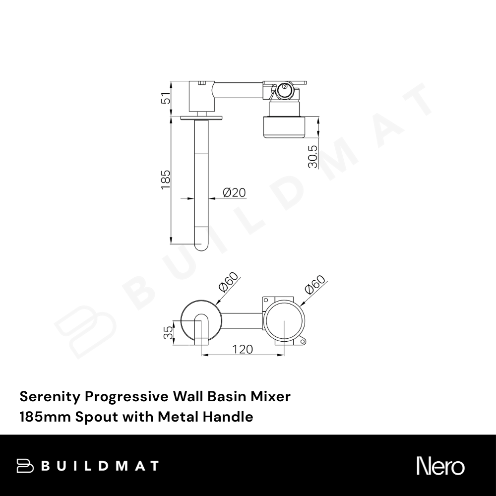 Nero Serenity Progressive Wall Basin Mixer 185mm Spout with Metal Handle Brushed Bronze