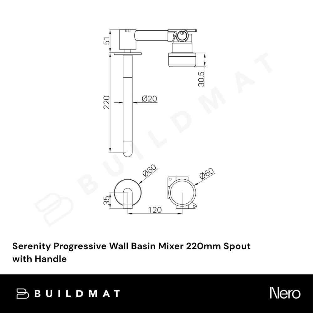 Nero Serenity Progressive Wall Basin Mixer 220mm Spout with Verde Alpi Handle Gunmetal