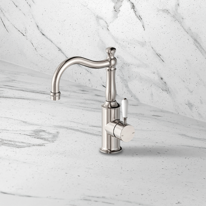 Nero York Basin Mixer Hook Spout With White Porcelain Lever Brushed Nickel