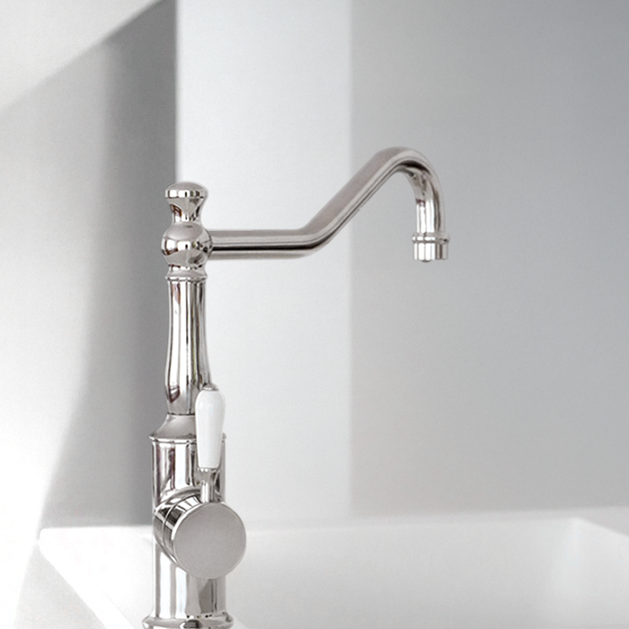 Nero York Kitchen Mixer Hook Spout With White Porcelain Lever Brushed Nickel