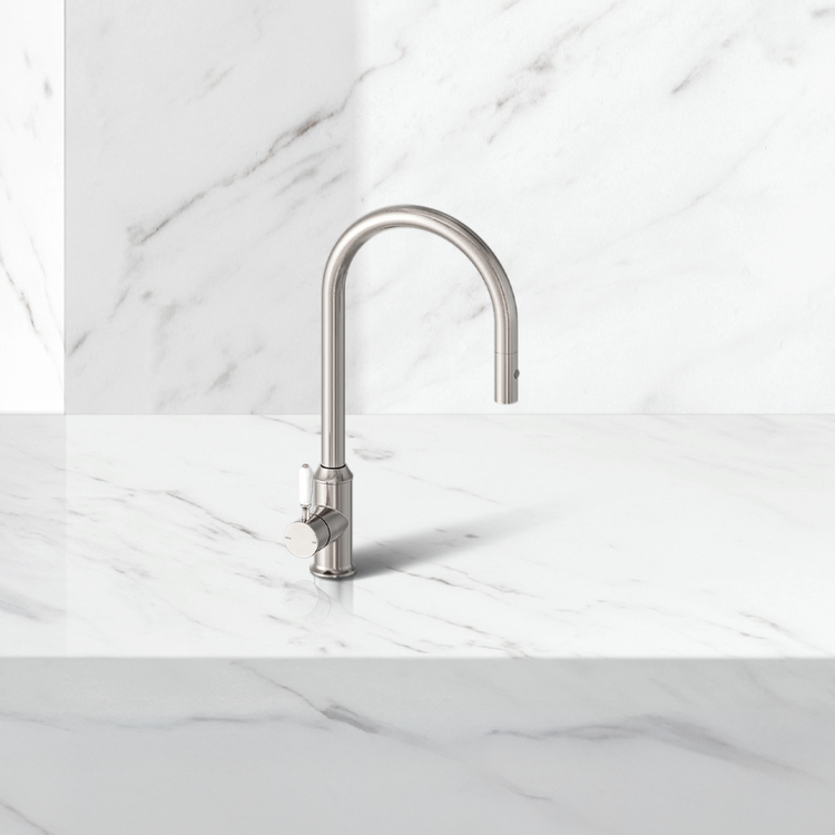 Nero York Pull Out Sink Mixer With Vegie Spray Function With White Porcelain Lever Brushed Nickel