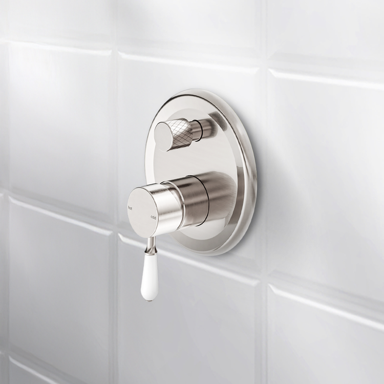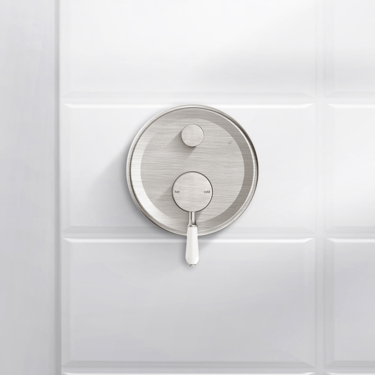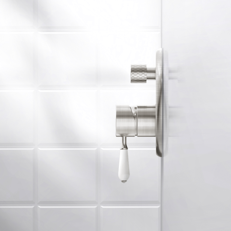 Nero York Shower Mixer With Divertor With White Porcelain Lever Brushed Nickel