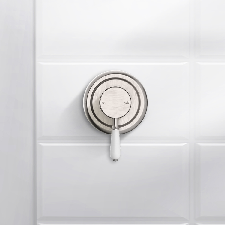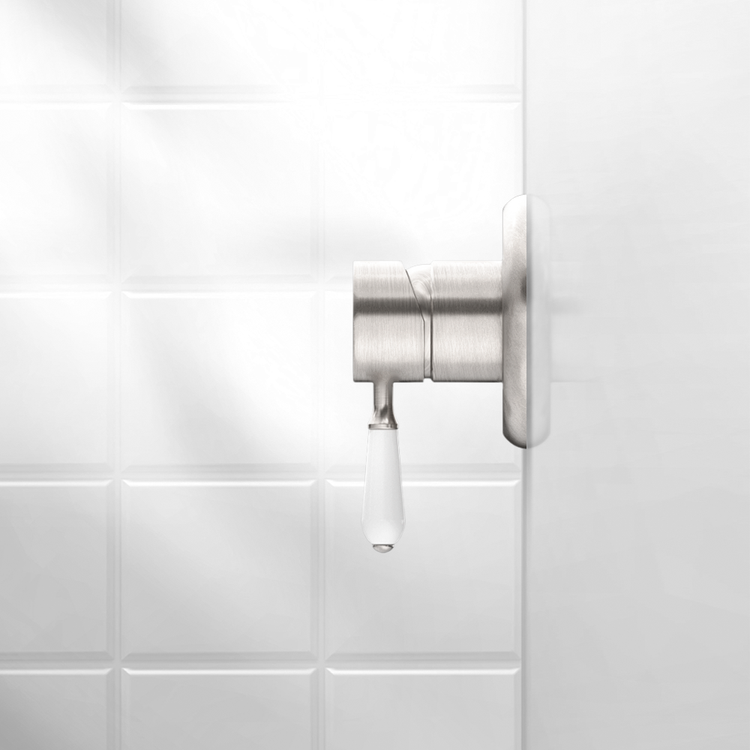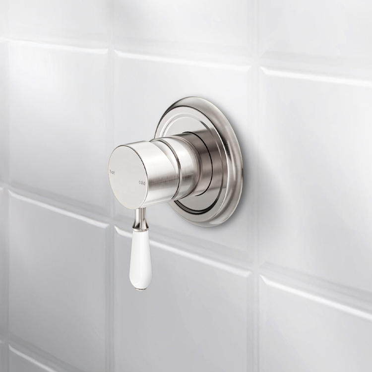 Nero York Shower Mixer With White Porcelain Lever Brushed Nickel