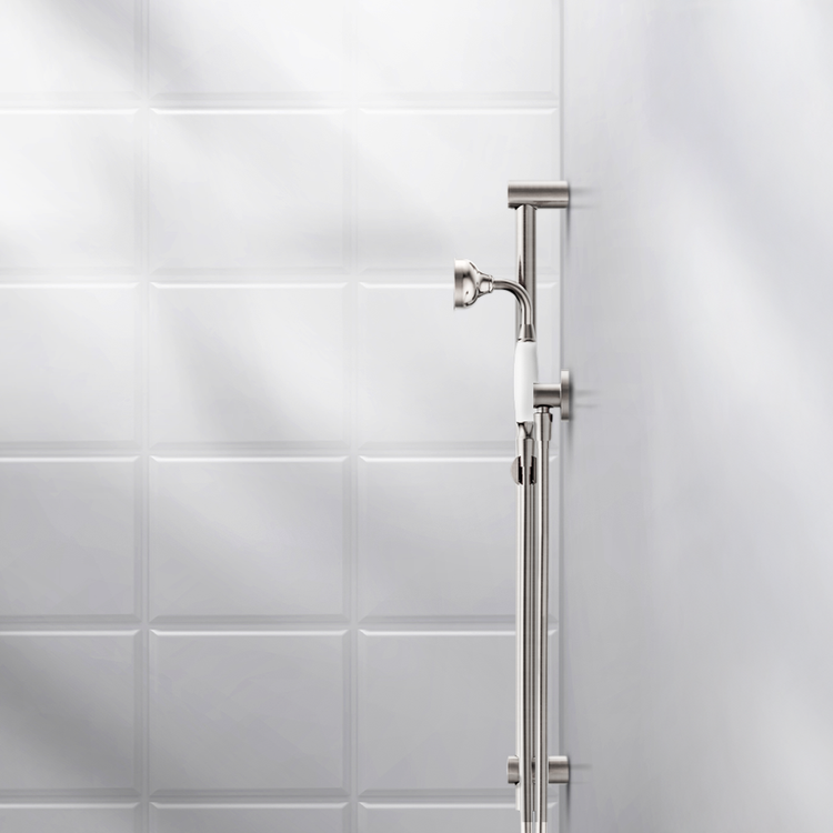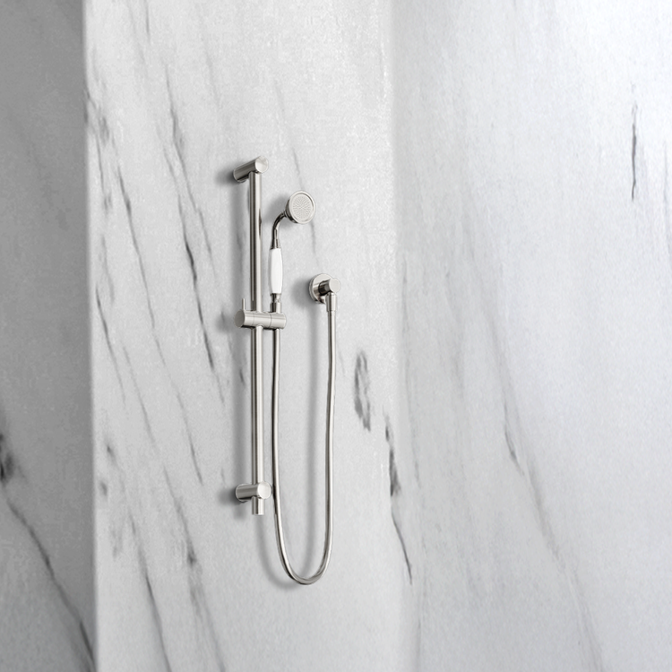 Nero York Shower Rail With White Porcelain Hand Shower Brushed Nickel