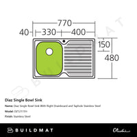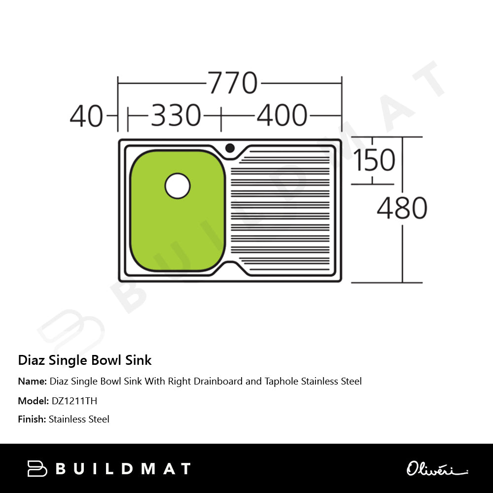 Oliveri Diaz Single Bowl Sink With Right Drainboard and Taphole Stainless Steel