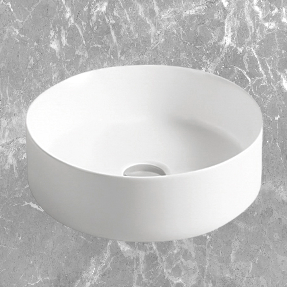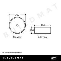 Size: 360x360x120 mmMounting: Above Counter Features: Matte White Fine Ceramic Pop up Waste Sold Separately Requires 32mm Waste, No Overflow Read more