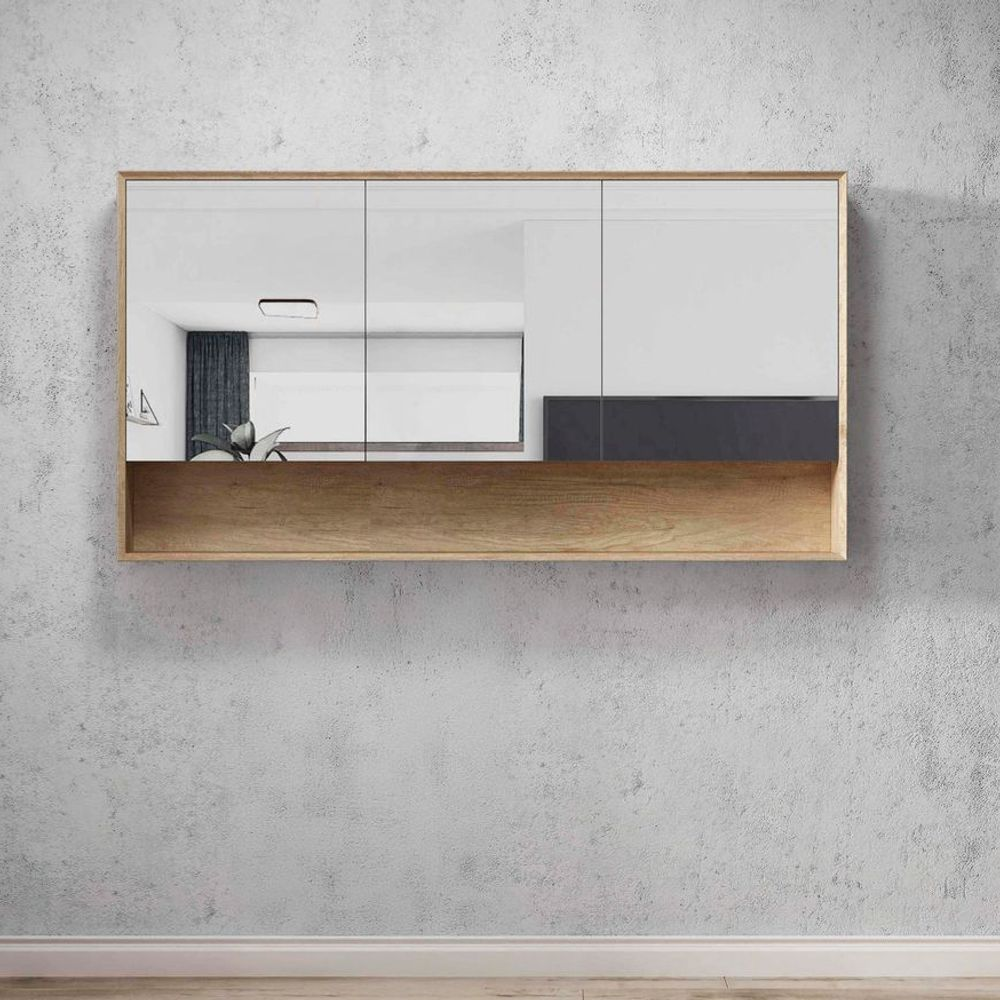 Features Cabinet: 1500x800x150mm Configuration: Wall Mounted Doors:3 Door Soft closing Handle: Finger pull Finish: Natural Oak Timber grain, Moisture Resistant Plywood Interior Finish: Natural Oak Timber grain Mirror: Exterior Mirror... Read more