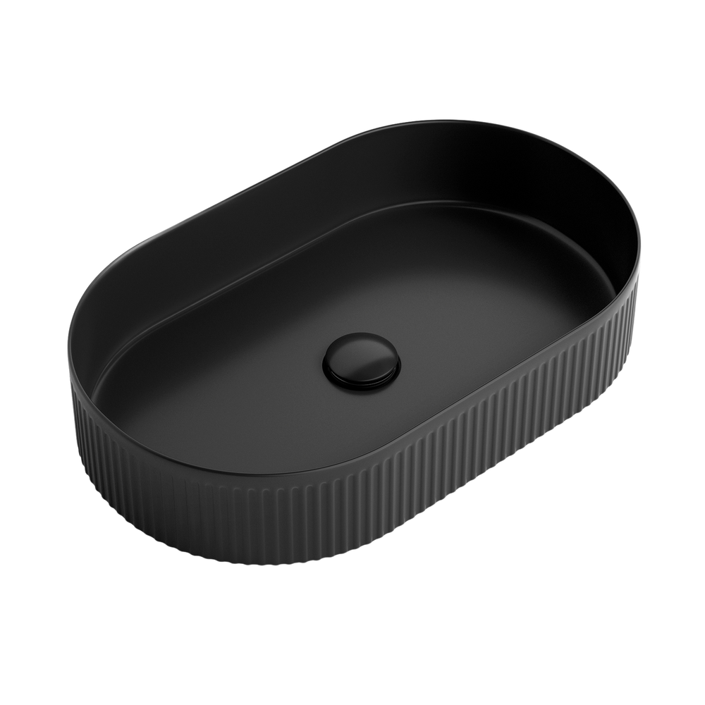 Size: 560x350x120mmMounting: Above Counter Features French Fluted Detail Design Matte Black Finish Oval Shape Taphole Recommendation Suitable with 12 Oclock Taphole or None for Wall Tapware (Not Recommended... Read more