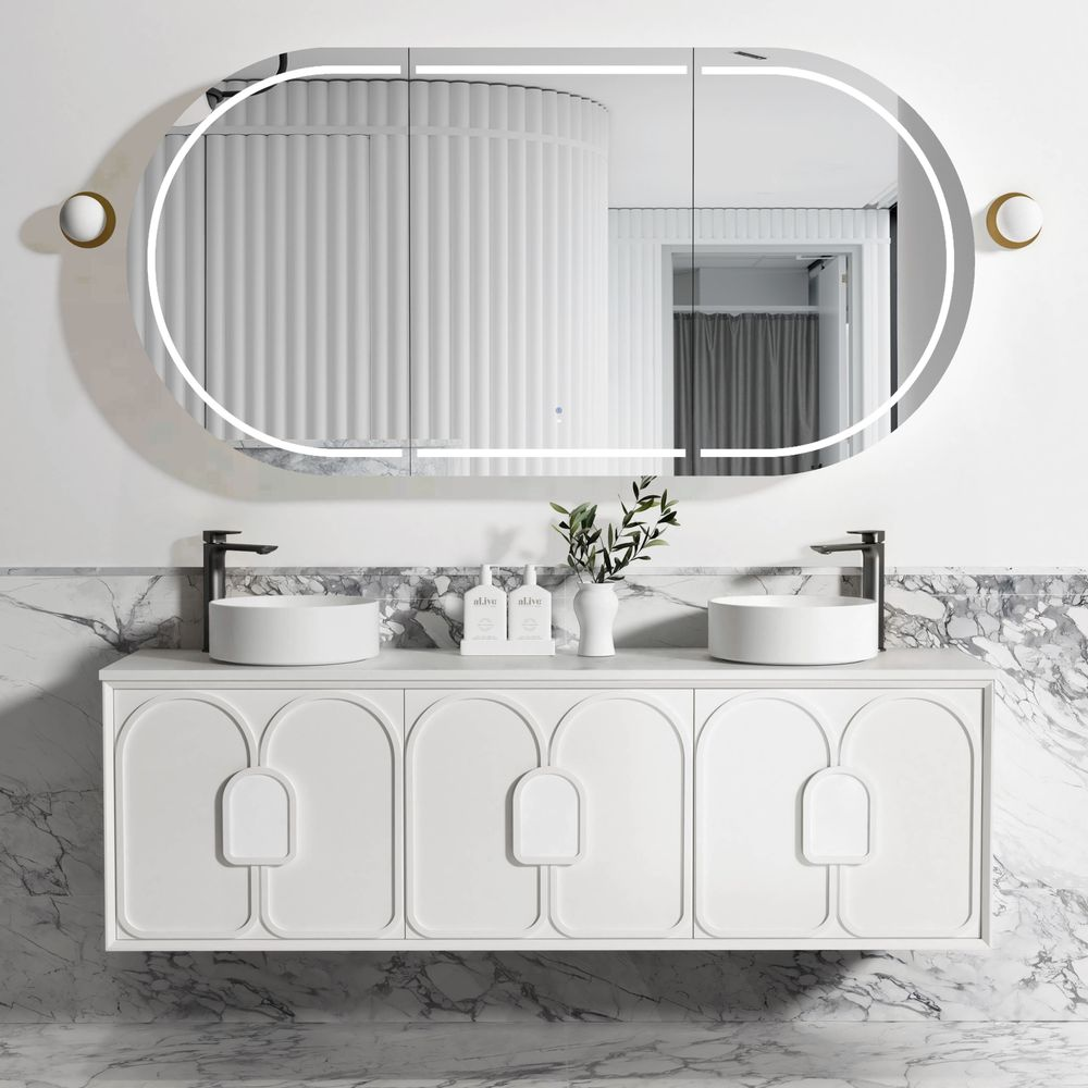 Otti Laguna 1800mm Satin White Wall Hung Vanity with Natural Carrara Marble Top and Double Bowl Undermount Basin