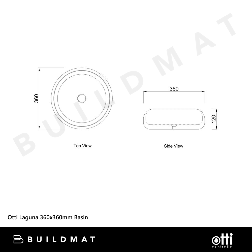 Size: 360x360x120 mmMounting: Above Counter Features: Matte White Fine Ceramic Pop up Waste Sold Separately Requires 32mm Waste, No Overflow Optional Color: Gloss White (OT3650) Read more