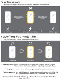 Size 900(H)x450(W)mmFeatures: Wall Mounted Vertically Anti-fog + 5mm Copper-free mirror with Acrylic Frame Motion Sensor & on/off Press Button LED light strip Adjustable colour temperature (6000, 4000 or 3000K) Wattage... Read more