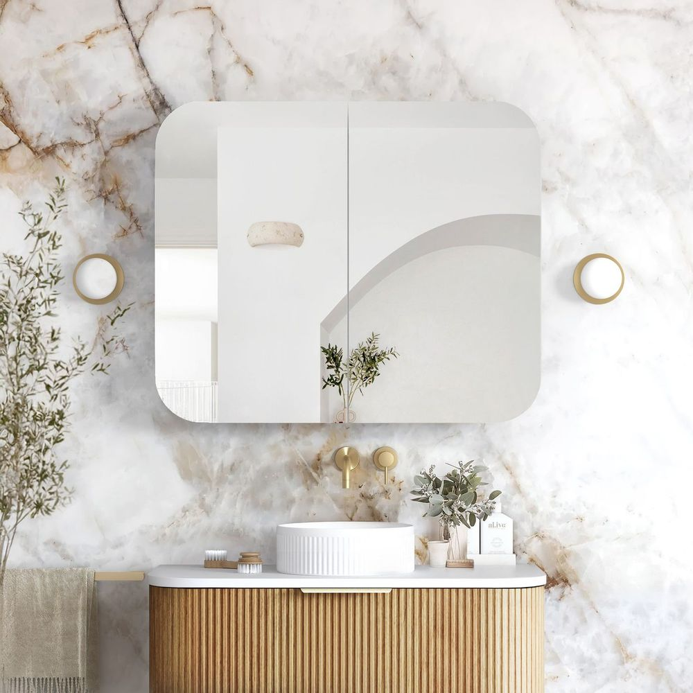 Door: 900(W)x750(H)mm Cabinet: 750(W)x600(H)x128(D)mm Features Configuration: Wall Mounted Doors: Butterfly 2 Doors Soft Closing Opening: Opening from the outside Handle: Fingerpull Finish: Woodland Oak; Curved Moisture Resistant Plywood Exterior Mirror... Read more