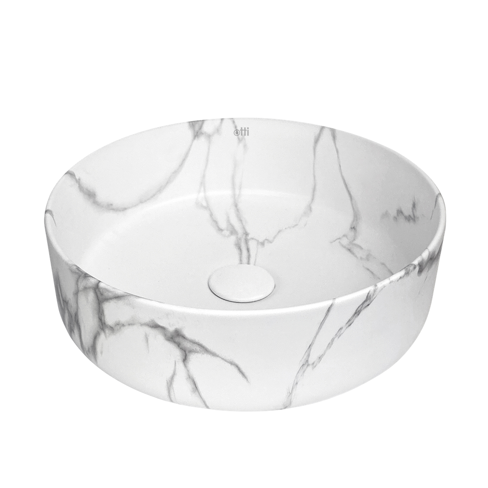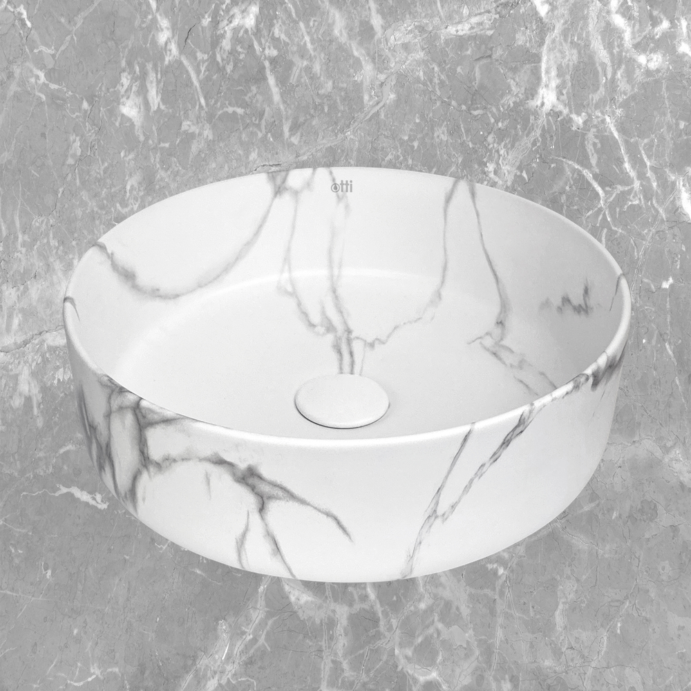 Size: 360x 360x120 mmMounting: Above Counter Features: Matte Marble look Pop up Waste Sold Separately Requires 32mm Waste, No Overflow Read more