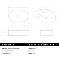 Above Counter Ceramic Basin Size: 450 wide x 110 high x 290 deep Bowl Capacity: 8L Tap Hole: N/A Overflow: N/A Material: Ceramic Product Code: TOPCPAT4528MW Finish Colour: Matte White... Read more