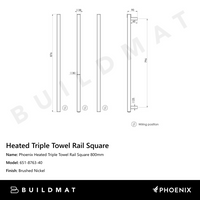 Phoenix Heated Triple Towel Rail Square 800mm Brushed Nickel