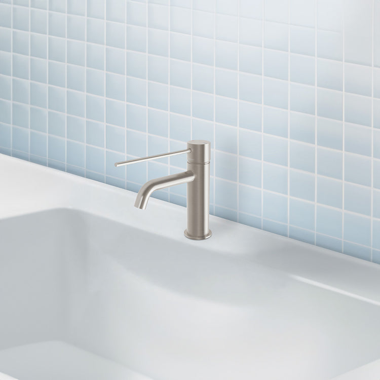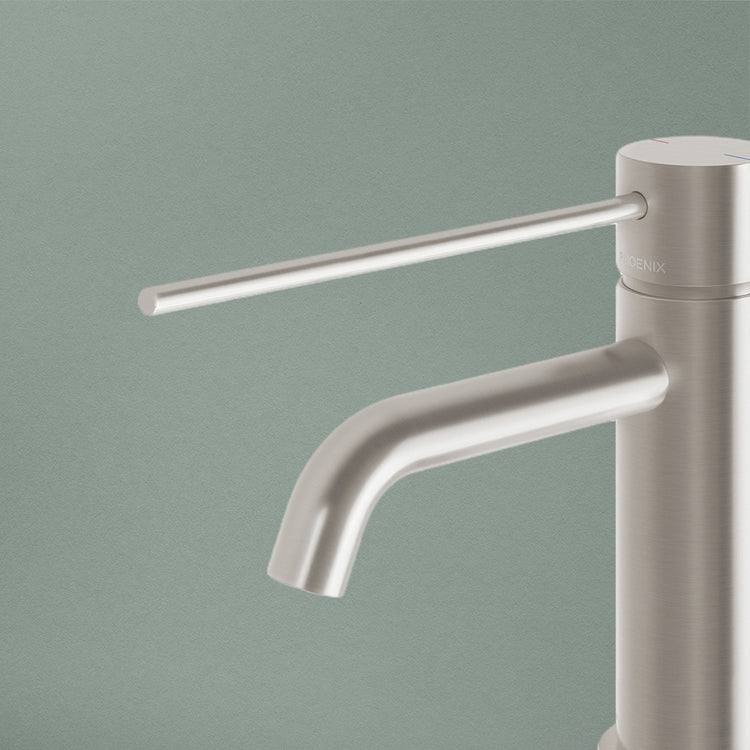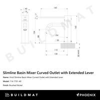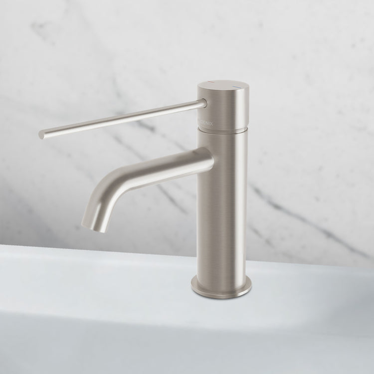 Phoenix Vivid Slimline Basin Mixer Curved Outlet with Extended Lever Brushed Nickel