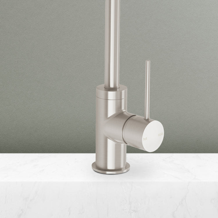 Vivid Slimline Sink Mixer 220mm Squareline Brushed Nickel Available with 160mm or 220mm spout reach 360° swivel spout for enhanced functionality Solid brass construction Lead Free composition 35mm ceramic cartridge... Read more