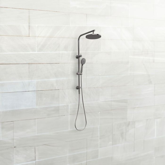 Vivid Slimline Twin Shower Brushed Carbon Top water inlet fits onto existing 1/2 plumbing Built-in, rotary diverter to switch from overhead shower to handpiece Brass rail, brackets and slider Supported... Read more