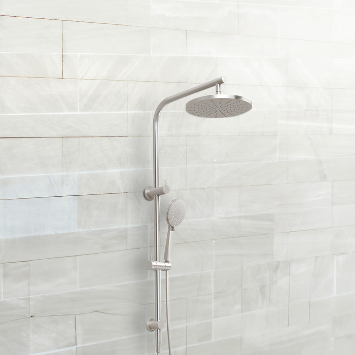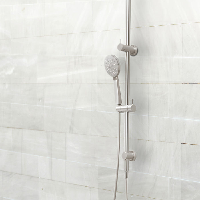 Vivid Slimline Twin Shower Brushed Nickel Top water inlet fits onto existing 1/2 plumbing Built-in, rotary diverter to switch from overhead shower to handpiece Brass rail, brackets and slider Supported... Read more
