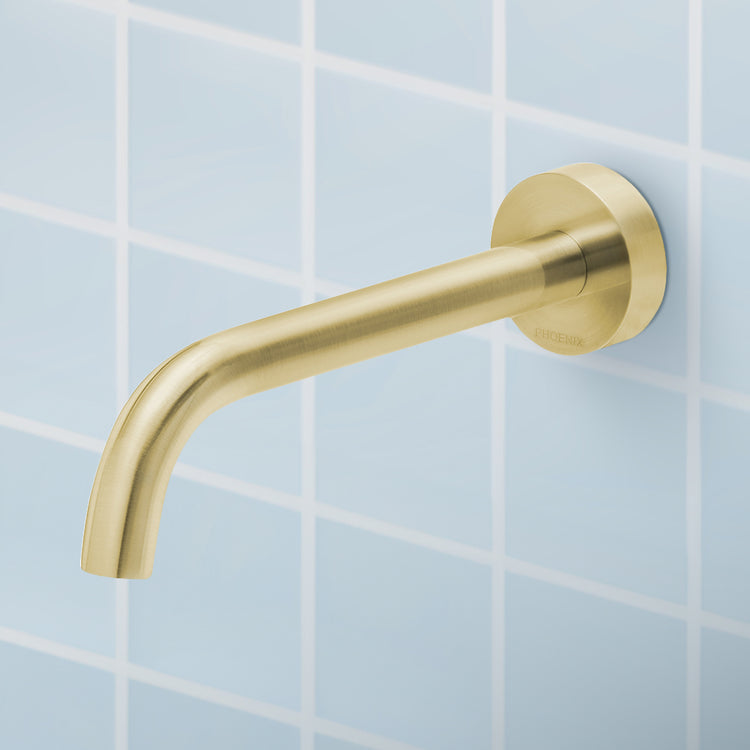 Vivid Slimline Wall Basin Outlet 180mm Curved Brushed Gold Available in both basin and bath options Available with 180mm or 230mm spout reach Screw on spout Brass construction Supported by... Read more